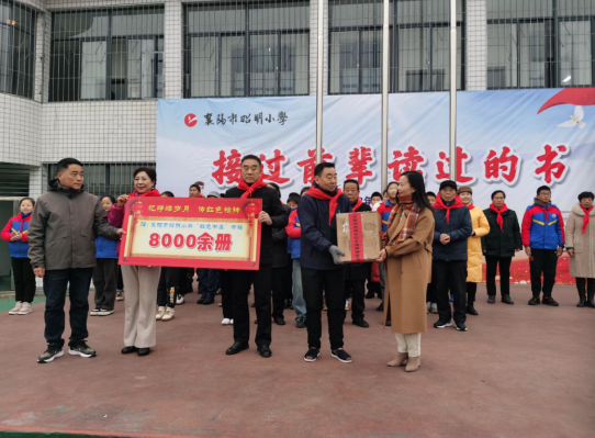 12月18日上午,在襄城区眧明小学“接过前辈读过书”爱心书屋,20位离退休老同志现场捐赠图书8000册。本次捐赠由市长寿研究会等非营利性社会组织发起,目的是通过捐赠红色书籍,传承红色精神。